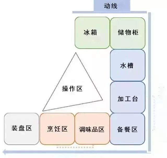 所以我们在布置厨房时,可以按冰箱、存放区、洗菜区、加工区、灶台、装盘区这样的顺序。